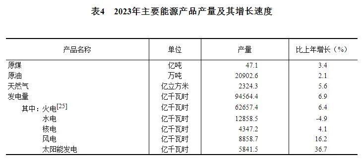 初步核算,全年一次能源生产总量48.3亿吨标准煤,比上年增长4.2%。其中,生产原煤4 7.1亿吨,增长3.4%;原油20902.6万吨,增长2.1%;天然气2324.3亿立方米,增长5.6%;发电量94564.4亿千瓦时,增长6.9。