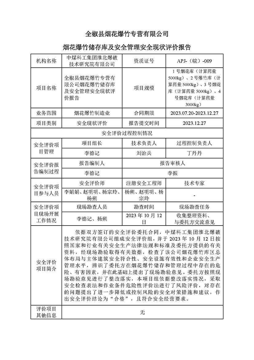 全椒县烟花爆竹专营有限公司 烟花爆竹储存库及安全管理安全现状评价