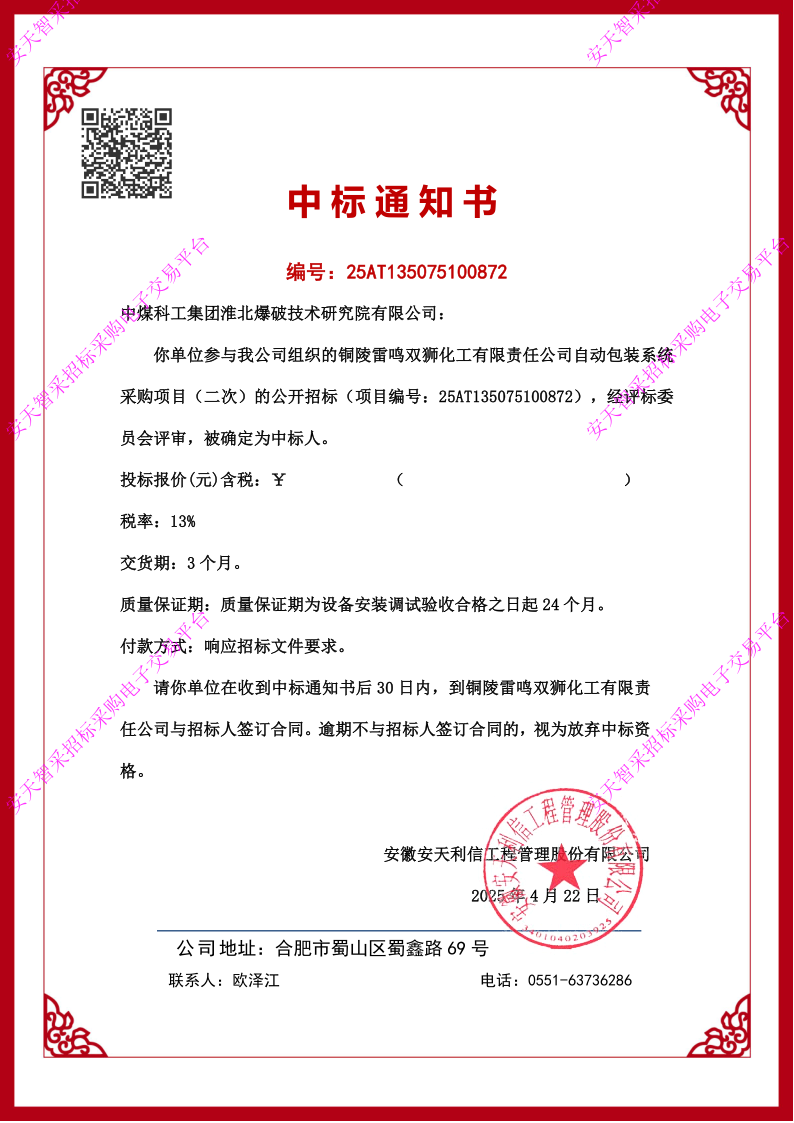 近日,爆破分院智能包装线项目捷报频传,凭借卓越的技术实力与优质的服务水平,连续中标湖北帅力化工有限公司和铜陵雷鸣双狮化工有限责任公司等多家包装线项目。