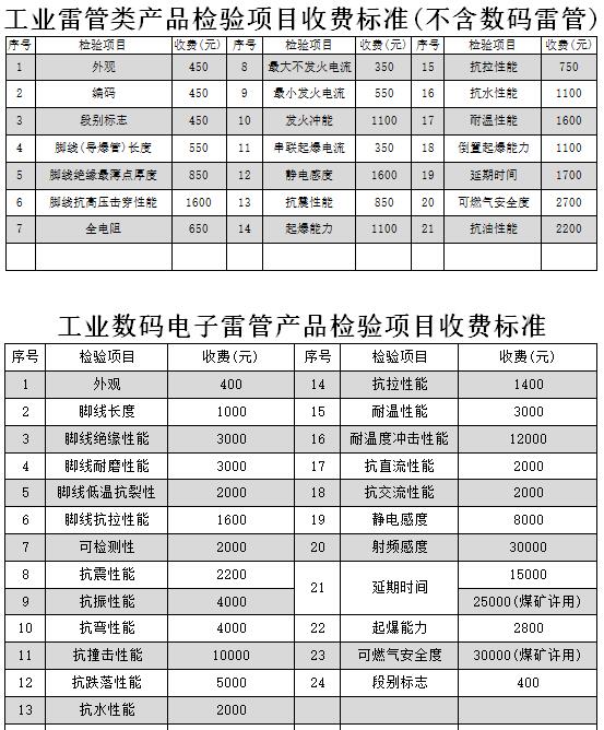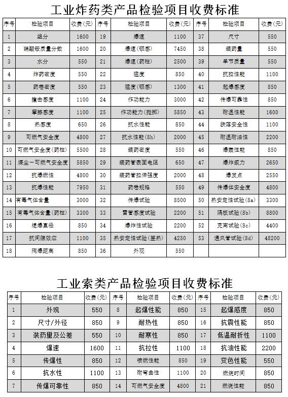 检测检验收费标准按现行自律性收费标准中相应检验项目要求执行,各检验项目单项收费标准如下: